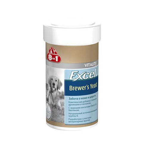 8in1 Excel Пивные дрожжи — пищевая добавка для собак и кошек, разработанная для поддержания здоровья кожи и шерсти. Комплекс содержит пивные дрожжи, богатые витаминами группы B, чеснок, витамины (в том числе биотин) и микроэлементы, включая медь и цинк.