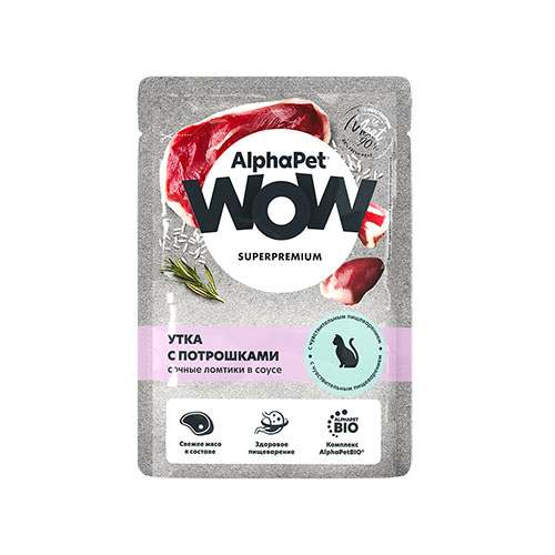 Влажный полнорационный корм для кошек AlphaPet WOW Superpremium с уткой и курицей — аппетитные мясные кусочки в соусе, приготовленные из большого количества свежего мяса и натуральных ингредиентов. Рацион обеспечивает питомца необходимыми питательными веществами и поддерживает здоровье благодаря комплексу натуральных добавок AlphaPetBIO®.