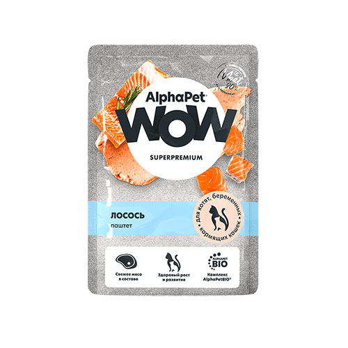 Влажный полнорационный корм для кошек AlphaPet WOW Superpremium с лососем — нежные мясные ломтики в соусе, приготовленные из большого количества свежего мяса и натуральных ингредиентов. Рацион обеспечивает питомца необходимыми питательными веществами и поддерживает здоровье благодаря комплексу натуральных добавок AlphaPetBIO®.