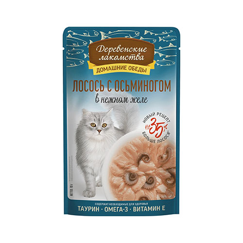 Консервированный влажный корм для кошек серии «Деревенские лакомства — Домашние обеды» с лососем и экзотическим осьминогом — это не просто лакомство, а настоящий кулинарный шедевр, созданный с любовью и заботой о ваших пушистых гурманах. Рецепт с богатыми омега-3 жирными кислотами, белком и минералами разработан специально для здоровья кожи и шерсти вашего питомца, а также для поддержания его иммунитета и общей физической формы. Легкая текстура желе облегчает процесс потребления лакомства, делая этот продукт идеальным даже для самых привередливых питомцев. Дополнительный корм для кошек (неполнорационный).