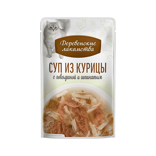 Мягкая текстура и приятный аромат супа из курицы с говядиной и шпинатом делают его особенно привлекательным даже для самых привередливых питомцев. Бульон, сваренный на основе натуральных ингредиентов, придает супу насыщенный вкус и способствует поддержанию водного баланса в организме кошки. Суп от «Деревенских лакомств» — это не просто еда, это выражение вашей любви и заботы о вашем пушистом друге.