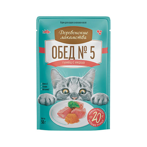 Консервированный влажный корм для кошек серии «Деревенские лакомства — Рыбные обеды» содержит большое количество мяса тихоокеанского тунца, которое идеально сочетается с насыщенным вкусом икры летучей рыбы. Подаётся в нежном желе, которое не только улучшает текстуру корма, но и способствует лучшему усвоению питательных веществ.