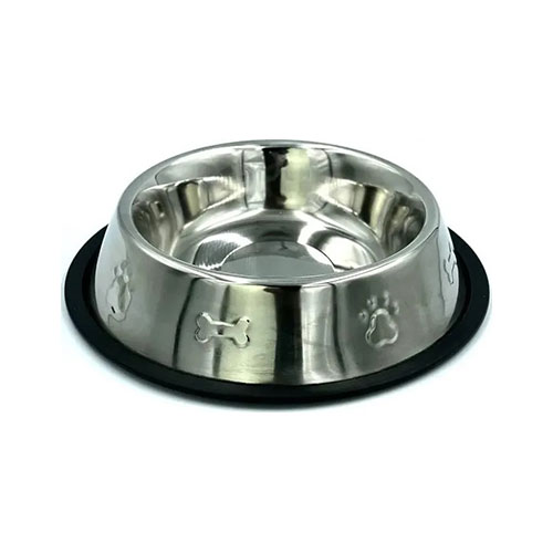 Резиновое противоскользящее кольцо на дне предотвращает скольжение и шум во время еды, а выпуклый рисунок в виде лапки и косточки на стенке придает миске стильный вид.