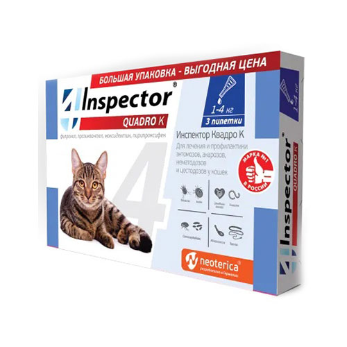 Зоомагазин «Царь Зверей» предлагает товар Neoterica (Неотерика) - Инспектор Quadro Капли для кошек 1-4 кг, 3 пипетки купить недорого c доставкой на дом в Астане. Совершать покупки товаров для домашних животных в интернет-магазине сегодня стало очень просто. Вам нужно лишь выбрать От внешних паразитов в разделе Антипаразитарные препараты и заказать понравившуюся продукцию. А делать это с нами еще и приятно. Здесь вас ждут: широкий ассортимент зоотоваров для «животное», выгодная цена, и профессиональная консультация онлайн.