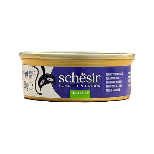 Schesir Tuna with Beef in Jelly — это полнорационный влажный корм для взрослых кошек, приготовленный из натуральных филе тунца, дополненных кусочками говядины и погружённых в мягкое растительное желе. Корм содержит всего несколько простых и натуральных ингредиентов, богат белком (13%) и отличается низким содержанием жиров (2.5%), что делает его питательным и легко усваиваемым. Он обогащён витаминами, минералами и таурином — важными элементами для здоровья и жизненной энергии кошки.