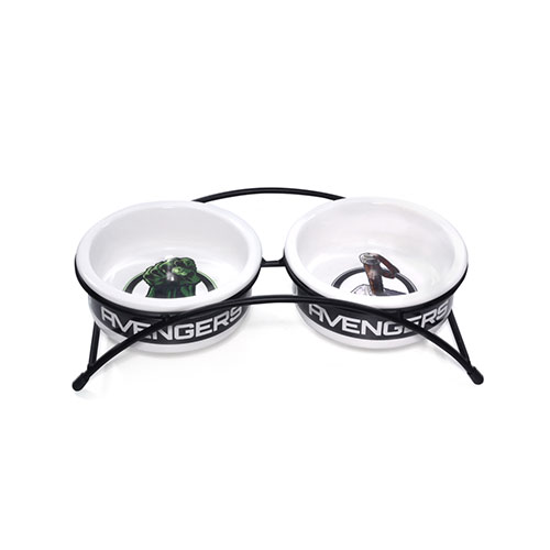 Этот функциональный комплект из двух универсальных круглых мисок на подставке с рисунком "Мстители" выполнен из керамики высокого качества и отлично подходит для кошек и собак мелких пород. Такие миски идеальны как для воды, так и для корма разной консистенции. Изделие комфортно для питомца и легко моется под струей проточной воды с использованием моющих бытовых средств. Размер: d дна – 11,2 см; d в верхней части – 12,5 см; высота – 4,5 см. Размер подставки – 28 х 13,5 х 6,5 см. Объем 2 х 250 мл