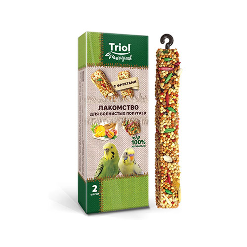 Лакомство для волнистых попугаев с фруктами: две палочки лакомства запаяны в полиэтиленовый пакет и уложены в картонную коробочку.