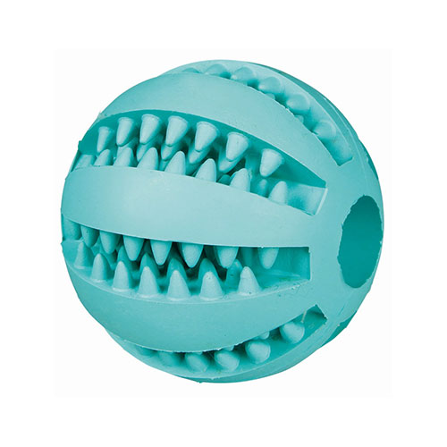 Игрушка в виде мячика, функция которого сводится не только к игре. Мячик принадлежит серии DentaFun бренда Trixie. Структура игрушки и натуральный каучук, из которого она сделана, хорошо массируют десны. Материал и особая конструкция мячика имеет небольшие выступы и шероховатости. Материал является полностью безвредным для здоровья собаки. Он прочный и эластичный, имеет приятный мятный оттенок зеленого цвета и отличается приятным мятным вкусом. По размеру подходит для средних и больших собак.