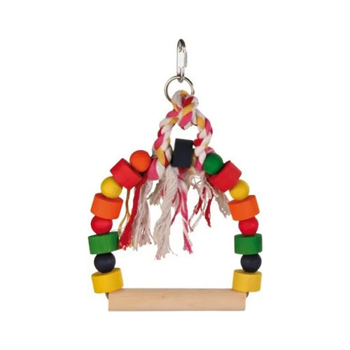 Красивые качели для попугаев и других некрупных экзотических птиц. Подвешиваются к потолку клетки в любом месте и отлично держатся благодаря металлическому карабину с резьбой, поэтому они не слетают, даже если ваши питомцы будут воевать за место. По всему верхнему периметру металлического каркаса нанизаны разноцветные деревянные игрушки, а сверху закреплен хлопковый канат - одна из любимых игрушек для птиц.