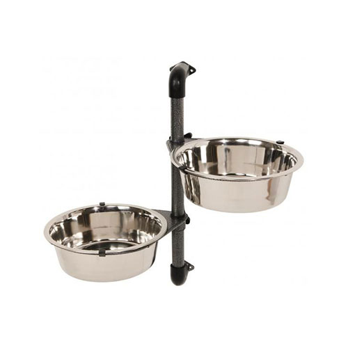 Две глубокие стальные миски на удобной стойке, которая монтируется на стену. Конструкция позволяет легко регулировать высоту мисок. Идеально подходит для собак, позволяя им во время приема пищи иметь правильное анатомическое положение.